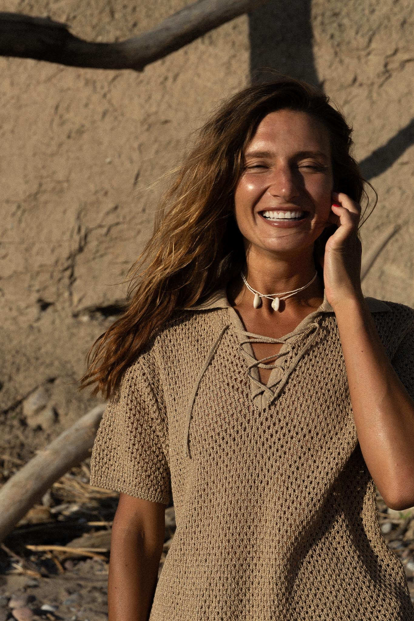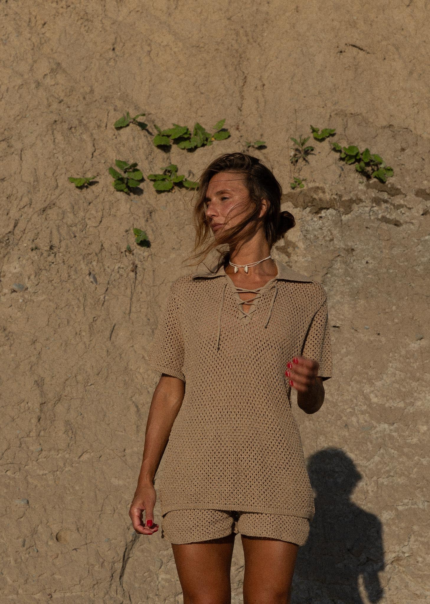 Das Poloshirt ist in Einheitsgröße mit lockerer Passform und überschnittenen Schultern erhältlich. Die Coco-Shorts sitzen auf der Taille und verfügen über einen verstellbaren Gummizug, der eine individuelle Passform gewährleistet. Ja, genau wie bei Kinderkleidung! Bei unseren Kundinnen hat es super funktioniert. Wir haben sie an einigen Freundinnen mit unterschiedlichen Körperformen und -größen anprobiert – alle waren sich einig, dass die Passform selbst während der Schwangerschaft perfekt passt!
