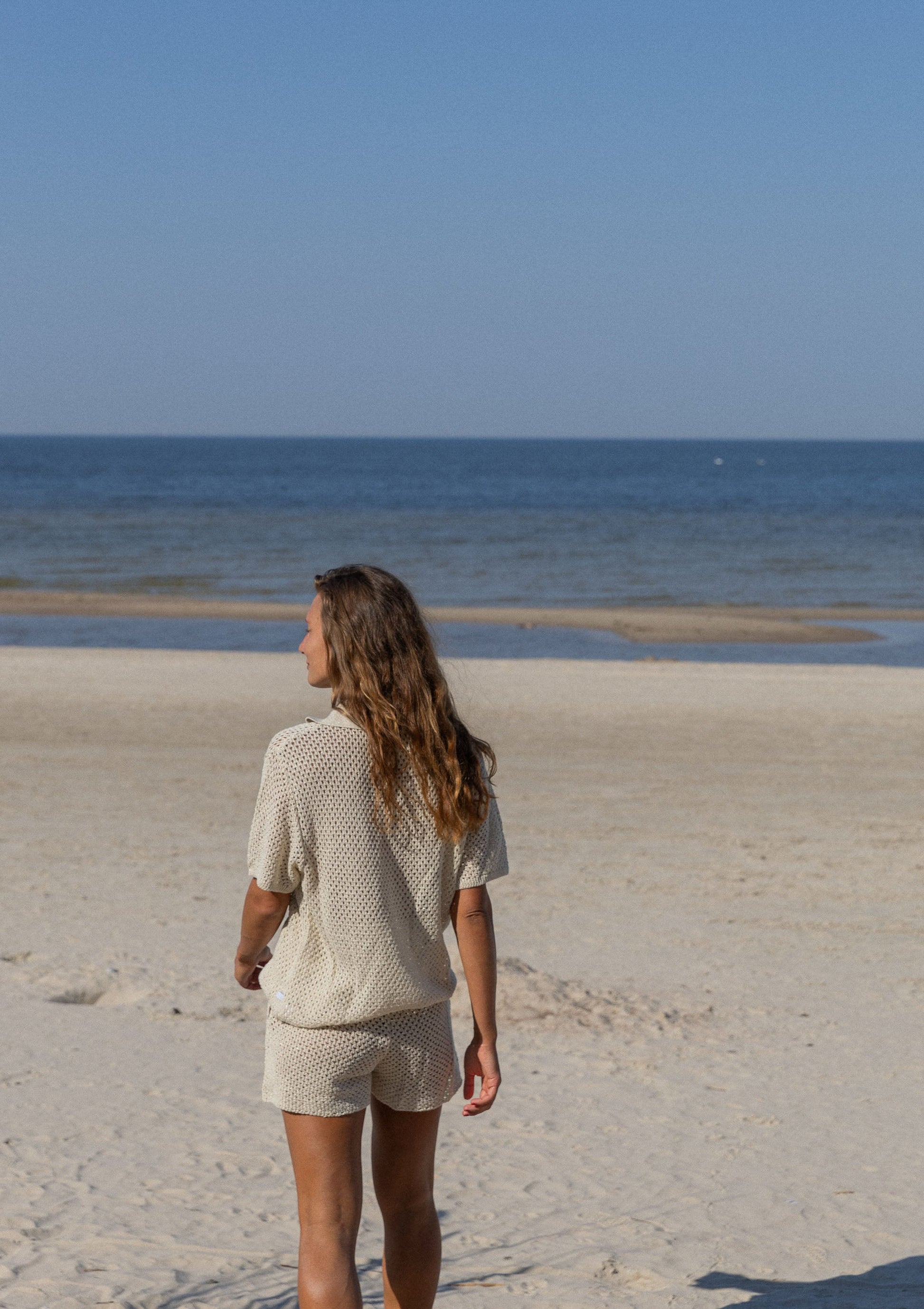 Die Coco-Shorts sind in einer luftigen Lochstrickkonstruktion gefertigt. Sie sind aus einem Baumwollmischgarn mit dezenten Pailletten gesponnen, die das Sonnenlicht reflektieren – das macht das Tragen zu einem wahren Vergnügen.