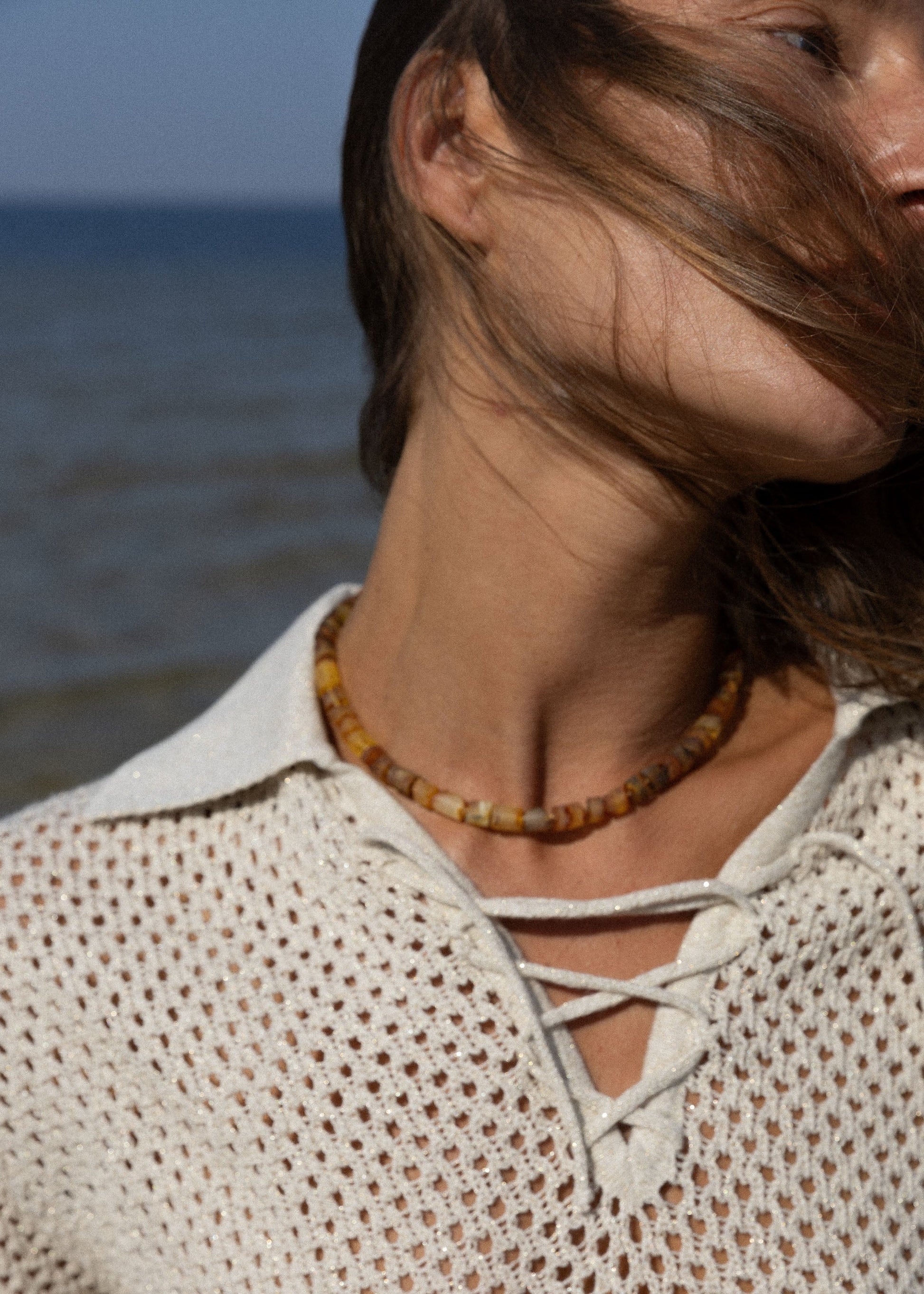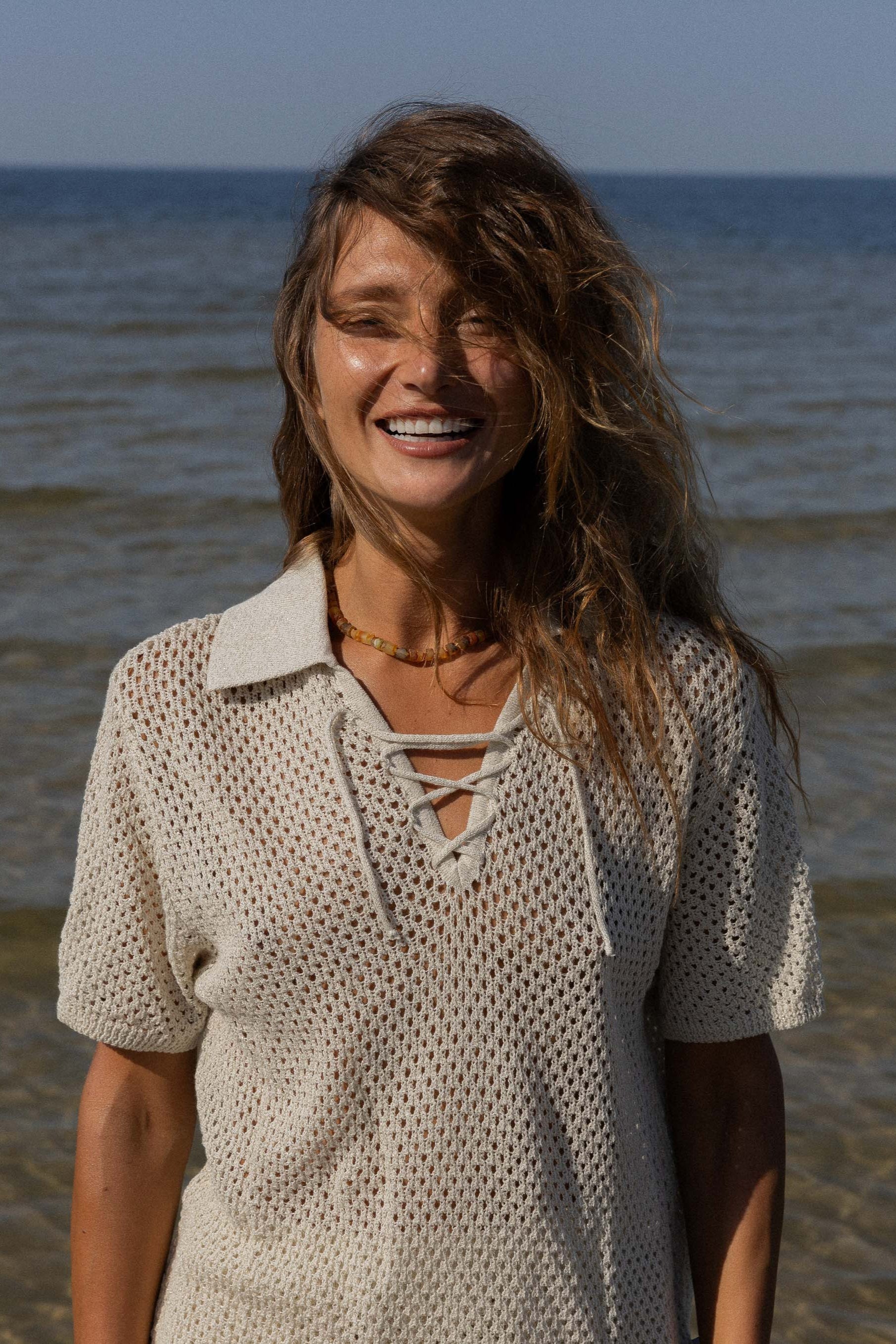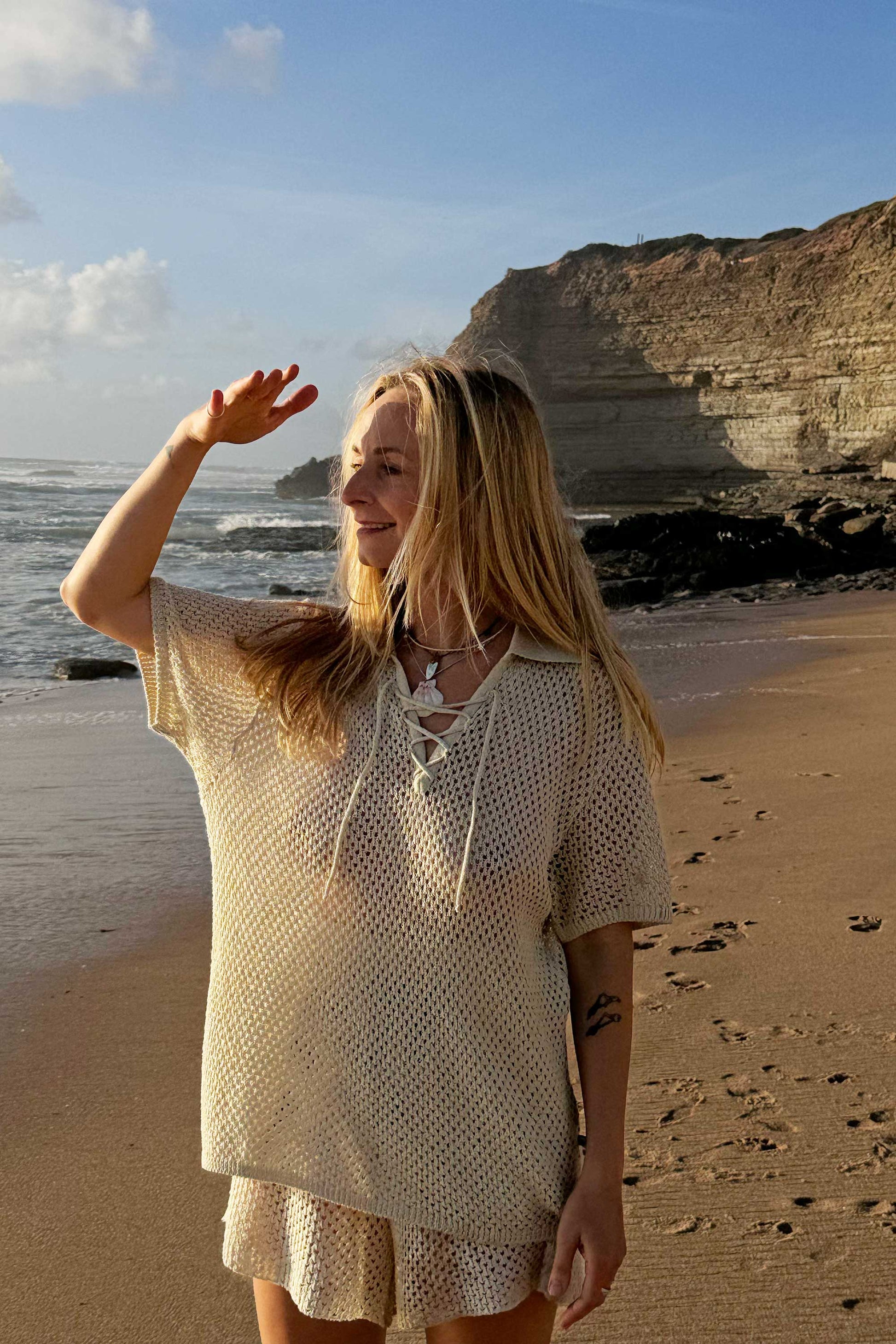 Das Coco-Shirt ist in luftiger Lochstrick-Konstruktion gefertigt. Es besteht aus einem Baumwollmischgarn mit dezenten Pailletten, die das Sonnenlicht reflektieren – das macht dieses Poloshirt zu einem wahren Tragevergnügen. Es ist als Einheitsgröße in entspannter Passform mit einem hübschen Polokragen und überschnittenen Schultern konzipiert.