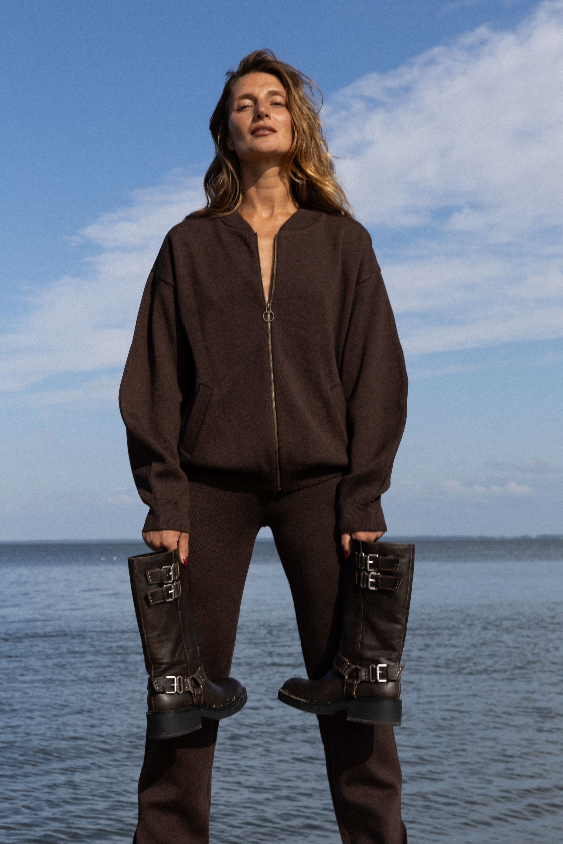Sie sitzen auf der Taille und verfügen über einen verstellbaren Gummizug, der eine individuelle Passform gewährleistet. Ja, genau wie bei Kinderkleidung! Bei unseren Kundinnen hat es super funktioniert. Wir haben sie an einigen Freundinnen mit unterschiedlichen Körperformen und -größen ausprobiert – alle waren sich einig, dass die Passform perfekt ist und sich sogar während der Schwangerschaft anpassen lässt! Kombinieren Sie sie mit dem Rotondo-Pullover für ein perfektes Kombi-Outfit.
