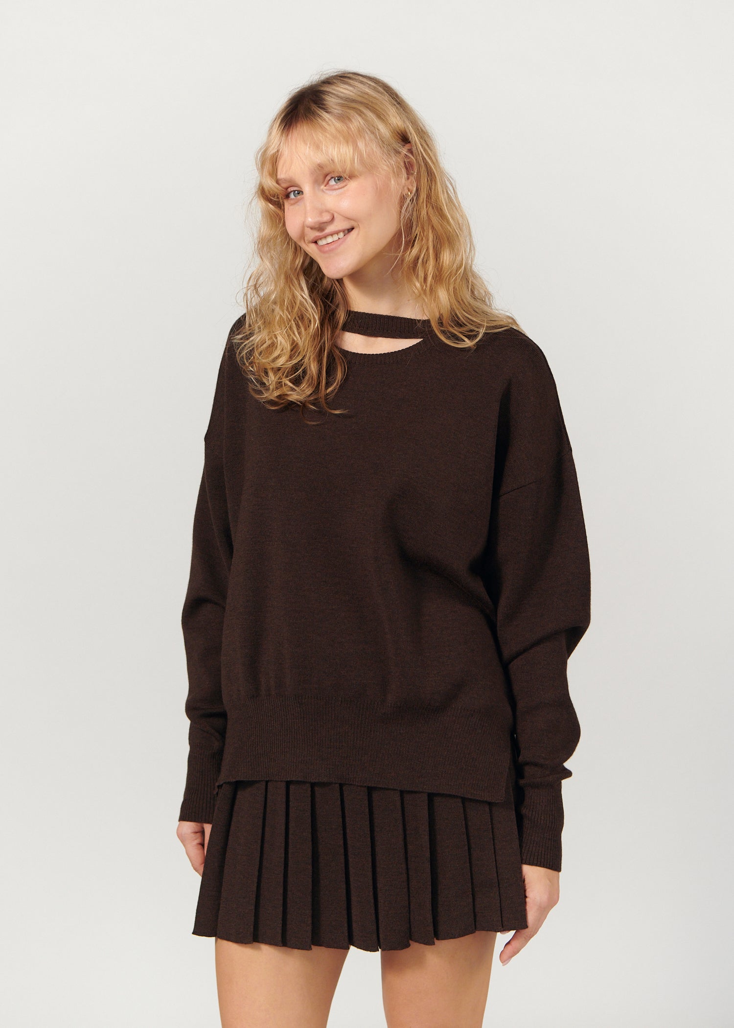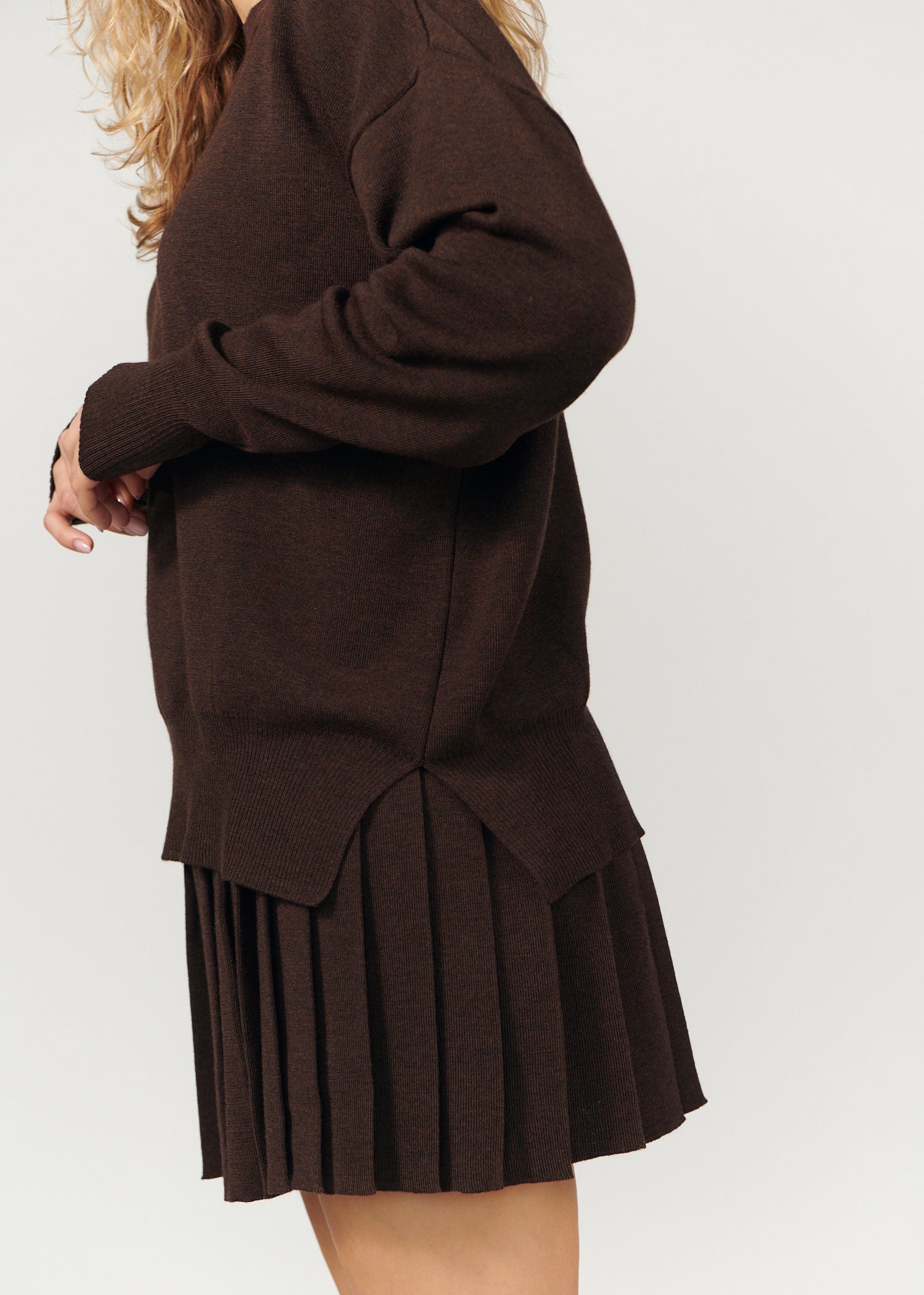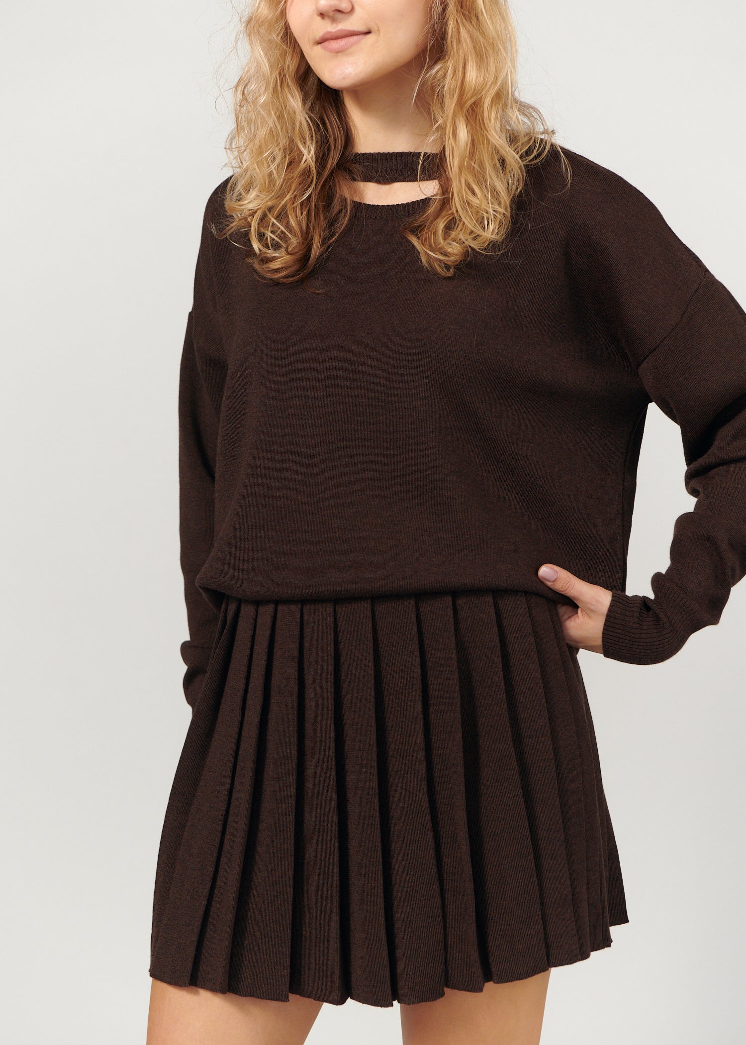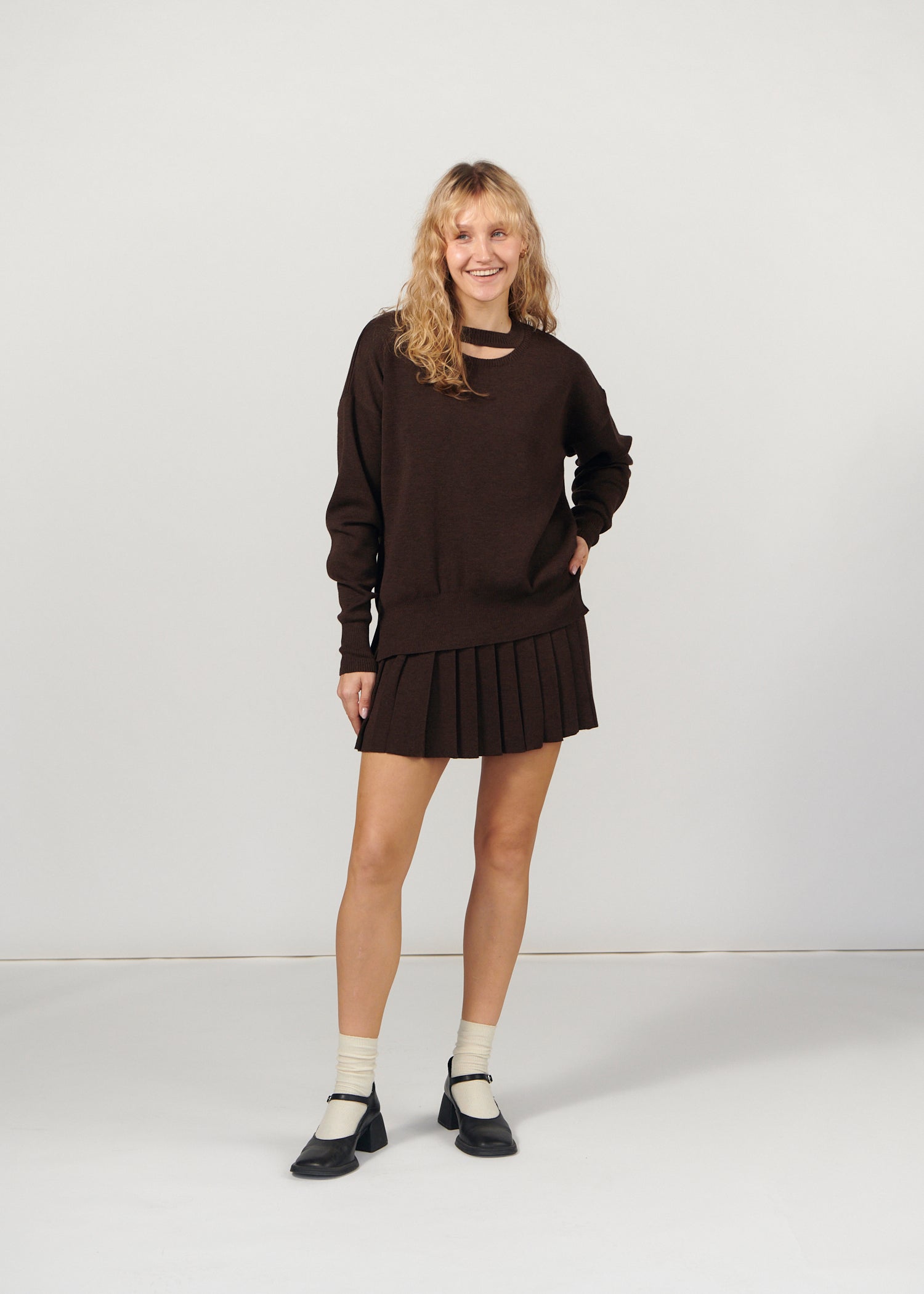 Der Rotondo-Pullover ist in Einheitsgröße erhältlich und hat eine übergroße Passform mit einem raffinierten Halsausschnitt, der ein wenig Haut freigibt. Der Piccolo-Faltenrock sitzt auf der Taille und verfügt über ein verstellbares Gummiband, das eine individuelle Passform gewährleistet. Zusammen ergeben sie ein stilvolles Zweiteiler-Set.