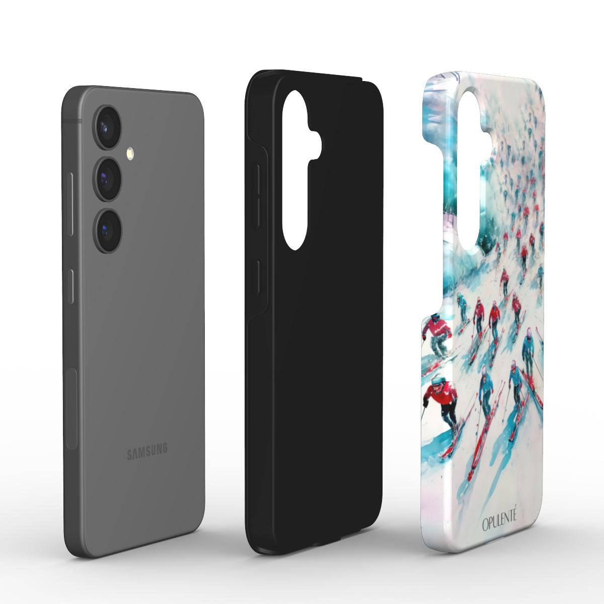 Feel the exhilarating rush of winter as skiers cascade down the snow-covered slopes in perfect harmony. “Alpine Momentum” captures the dynamic energy of the mountains, where every skier’s movement is a testament to precision and power. The cool hues and vivid strokes embody the thrill of the descent, making this piece a celebration of nature’s raw beauty and the elegance of controlled speed.