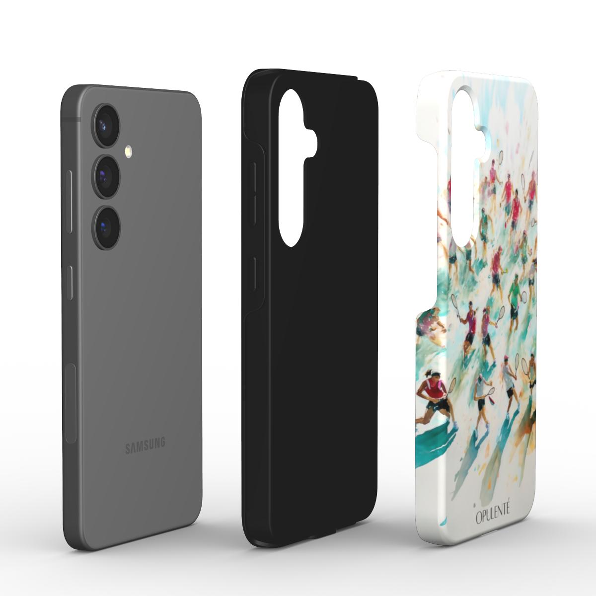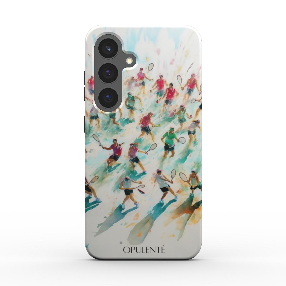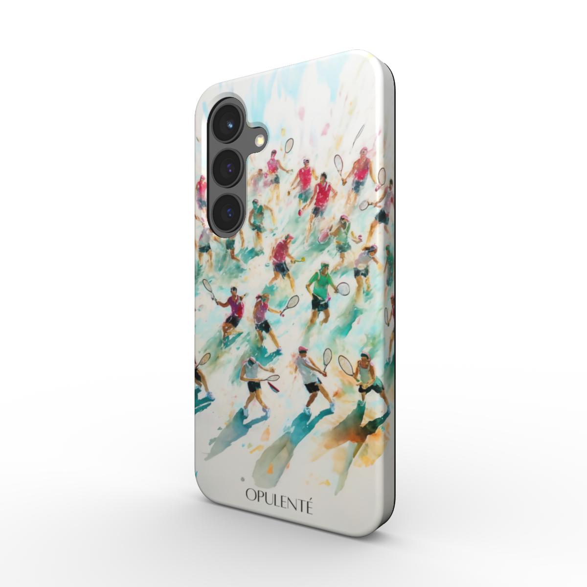 Engage in the fast-paced elegance of “Ethereal Exchange,” where tennis players compete on a sun-dappled court with intense focus and agility. The swift, fluid movements of the athletes are captured with dynamic brushstrokes, highlighting the grace and power that define the sport. This piece celebrates the blend of strategy, speed, and refined technique, encapsulating the spirit of competition in its most artful form.