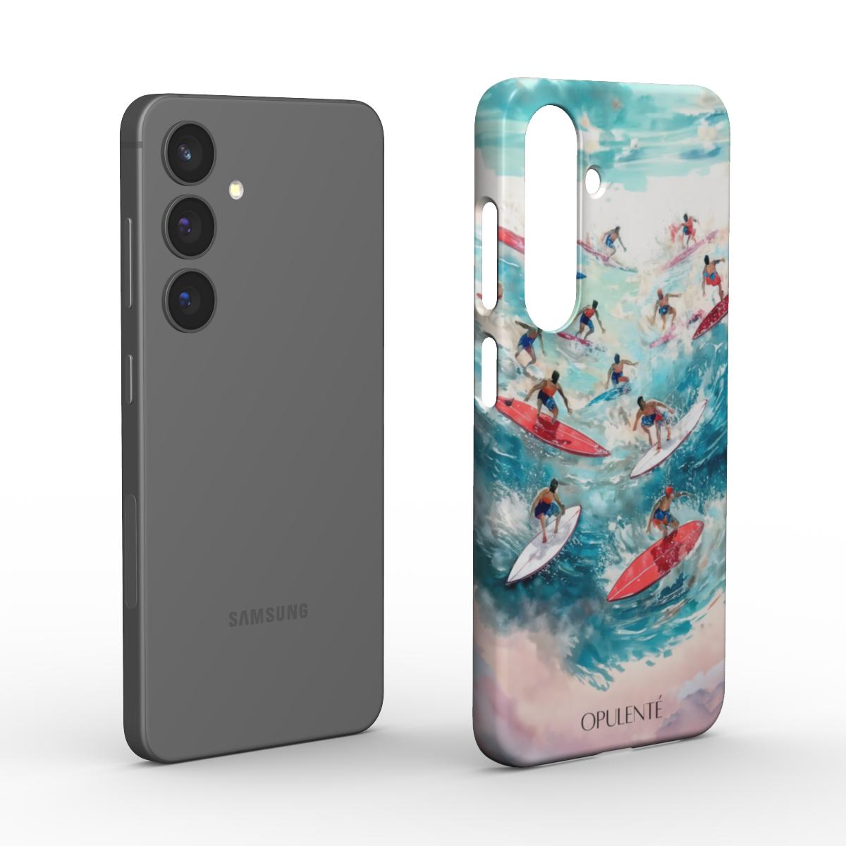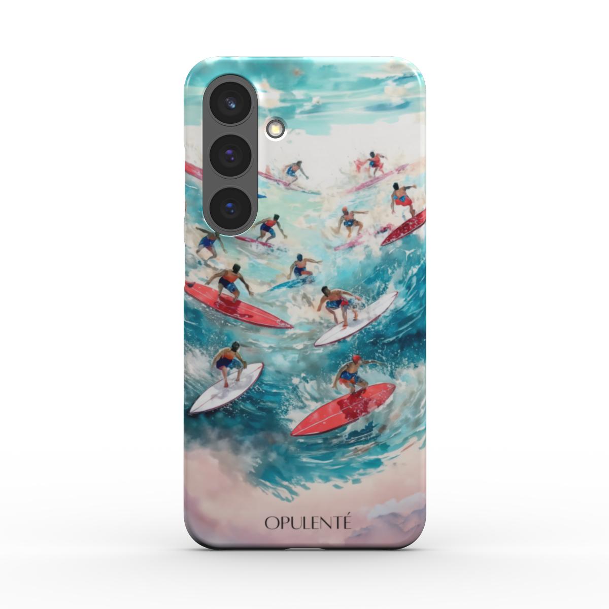 Experience the rhythm of the waves with “Oceanic Harmony,” where surfers masterfully navigate the surging tides. The scene is a vibrant tribute to the bond between human skill and nature’s force. With every stroke, the ocean’s fluidity and the surfers’ agility blend seamlessly, creating a captivating dance on water that speaks of adventure, balance, and the untamed spirit of the sea.