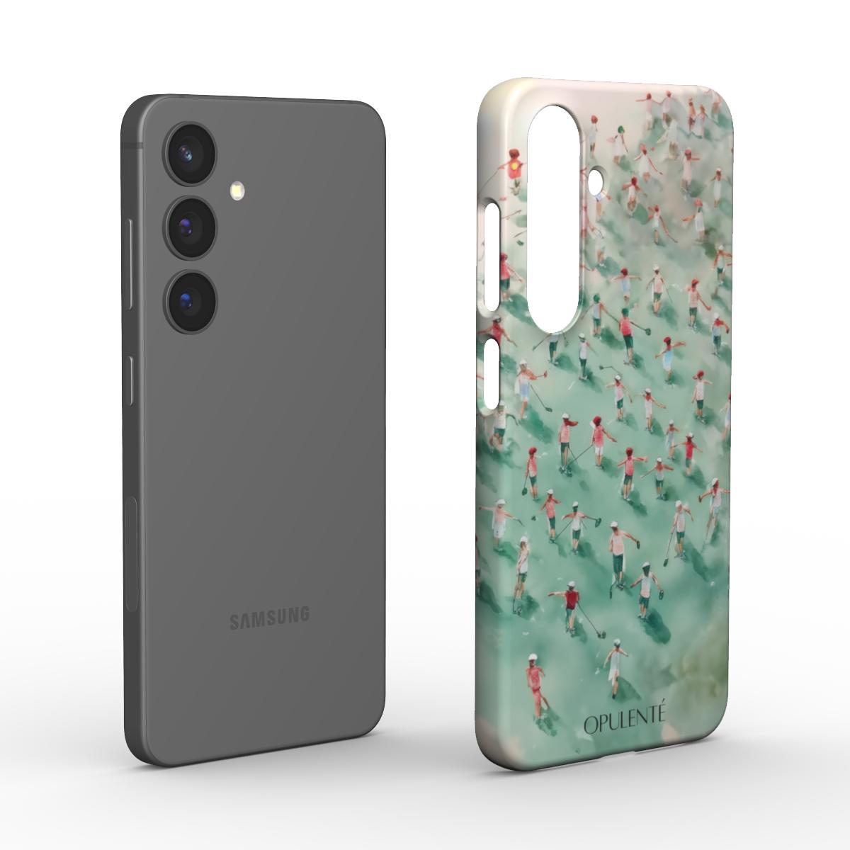 Immerse yourself in the tranquil yet focused world of “Verdant Precision,” a stunning portrayal of golfers mid-swing on a lush green course. The calmness of the landscape contrasts with the concentration of the players, capturing a moment of perfect alignment between mind, body, and nature. This piece embodies the essence of golf—where precision, patience, and the beauty of the environment converge in a harmonious display of skill.