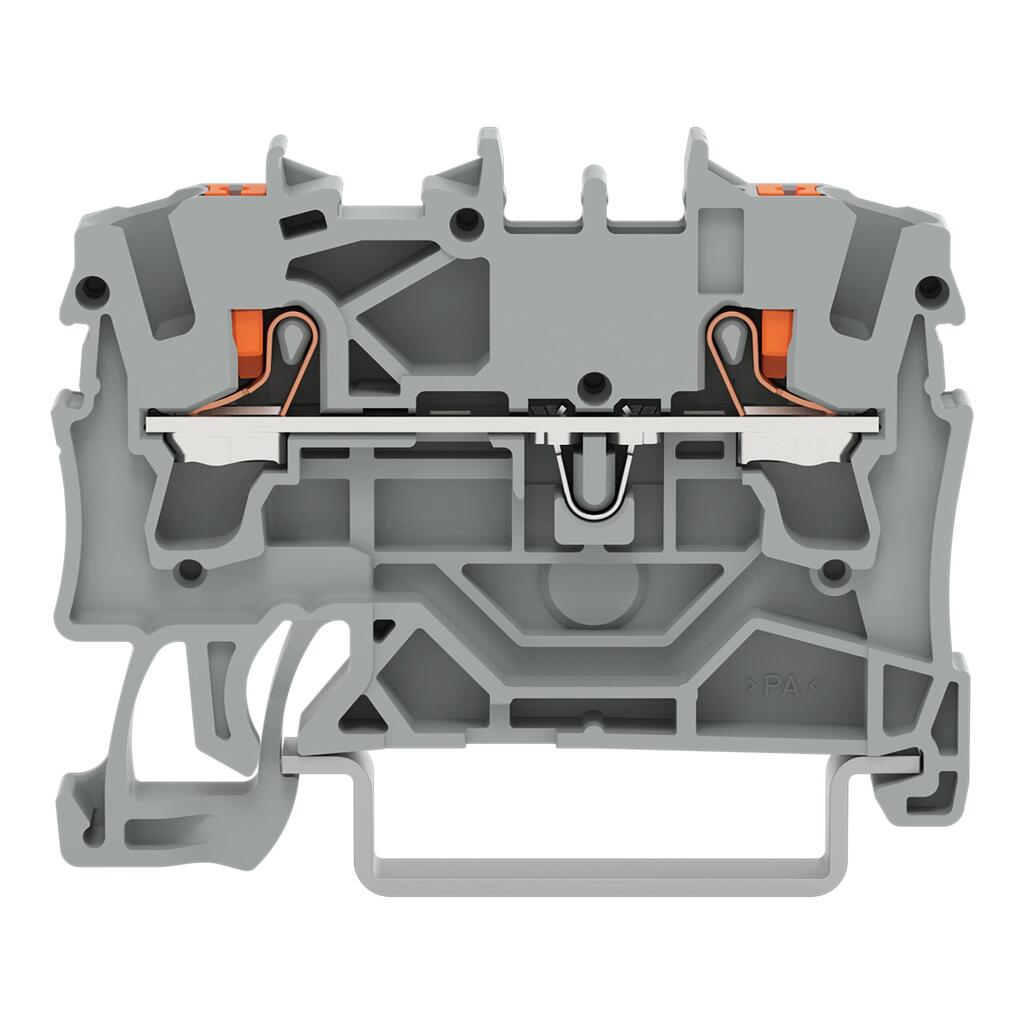 2-conductor through terminal block, with push-button; 2.5 mm², with test port. Suitable for Ex e II applications, side and center marking. For DIN-rail 35 x 15 and 35 x 7.5. Push-in CAGE CLAMP®, 2,50 mm², gray.