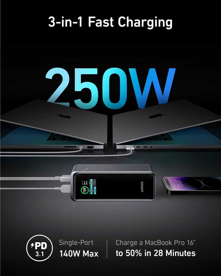 🔋 Anker Prime Power Bank 27650 mAh 250W Juoda - PD 3.1 | Anker App | MacBook Pro | 37min Įkrovimas