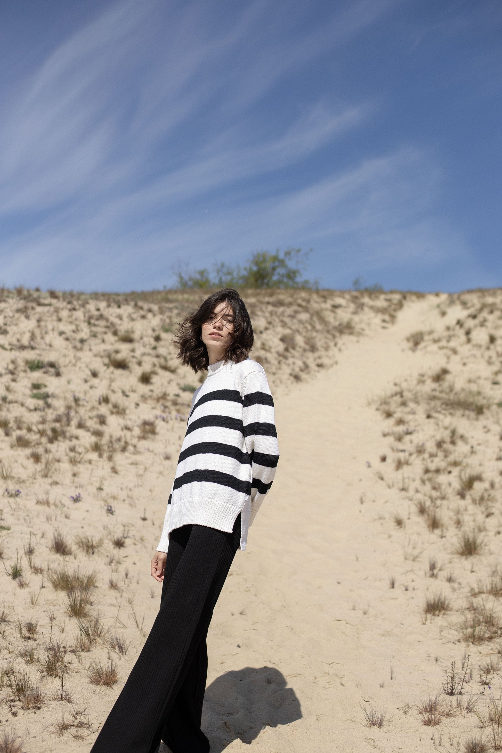 A classic yet contemporary marinière sweater with a slightly oversized silhouette, elongated sleeves, and a split hem - all designed to offer a flattering fit for a variety of body types. Its timeless shape and clean lines make it an easy, everyday essential that pairs effortlessly with the rest of your wardrobe.