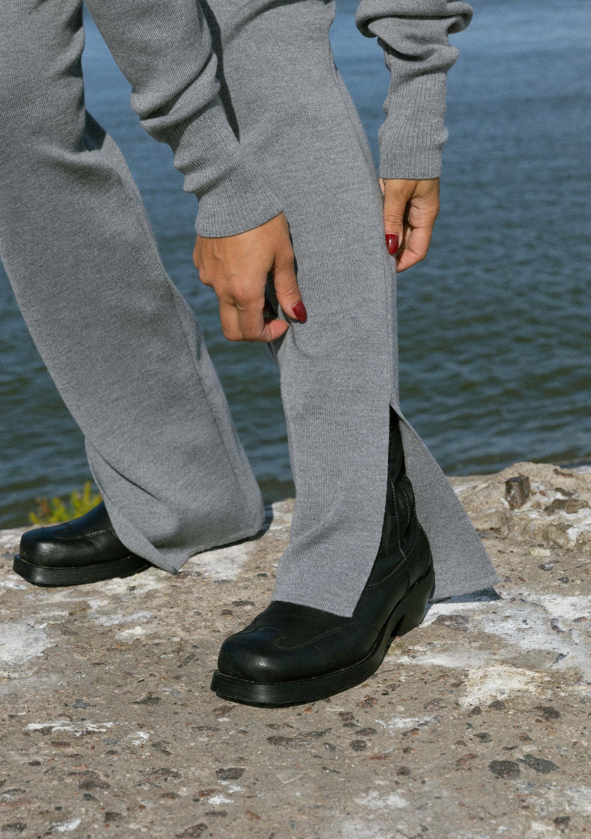 Rotondo jumper has a slightly oversized fit with an intricate neck cutout to reveal just a bit of flesh. Ora pants have relaxed straight legs with split hems, side pockets and an adjustable elastic band ensuring a personalized fit. Yes, just like in children's clothes! It worked great for our clients. We tried them on on a bunch of our friends with different body shapes and sizes - they all agreed the fit was just perfect to adapt even during pregnancy! It's inspired by the idea of a modern uniform - clothes that are beautifully made and can be styled in multitude ways.