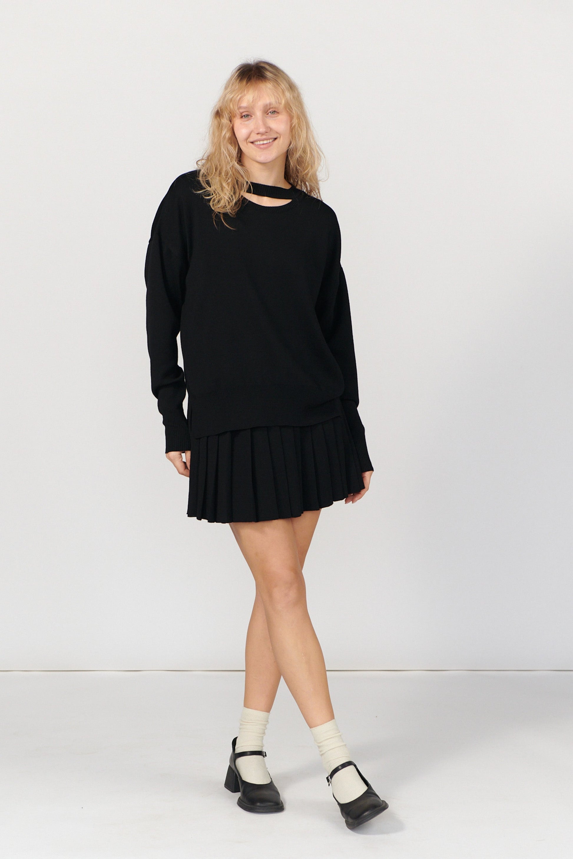Rotondo Jumper is our beloved and sought-after style. It features a relaxed silhouette and neck cutout to reveal a bit of flesh. Designed as One Size with a stretchy fit, it’s just the right size for different body types.