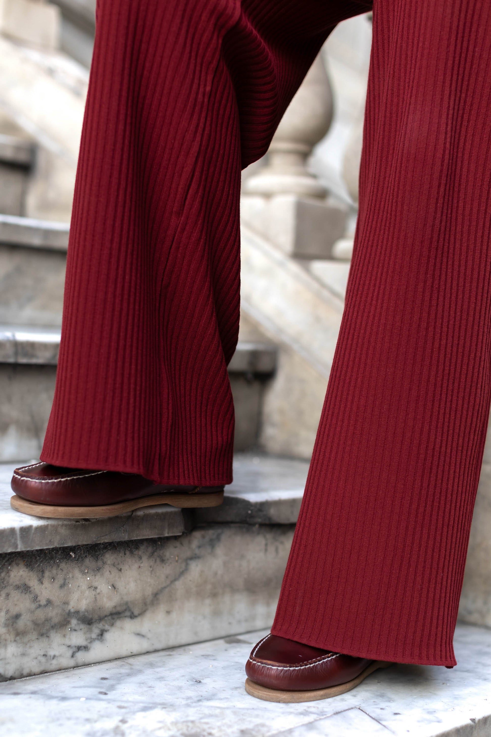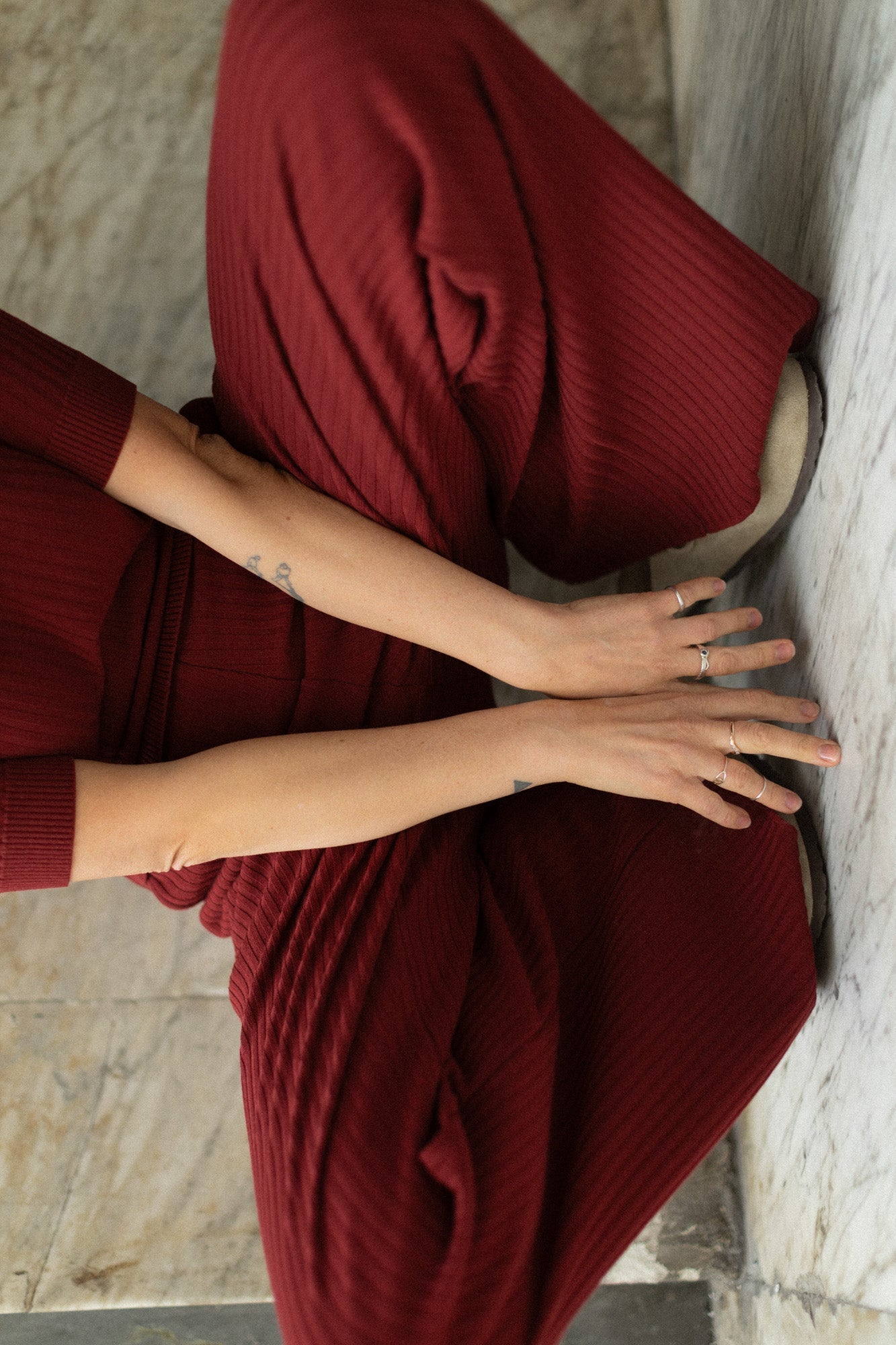 Vera pants are ribbed for tactility and cut in a relaxed wide-leg shape. They sit on the waist with an adjustable elastic band ensuring a personalized fit. Yes, just like in children's clothes! It worked great for our clients. We tried them on on a bunch of our friends with different body shapes and sizes - they all agreed the fit was just perfect to adapt even during pregnancy!